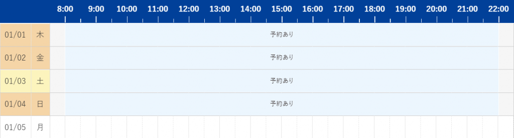 スケジュール上の「予約あり」は占有利用がある時間帯、それ以外は占有利用予約がない時間帯です。(スケジュール上の「済」も占有利用がない時間帯です。)